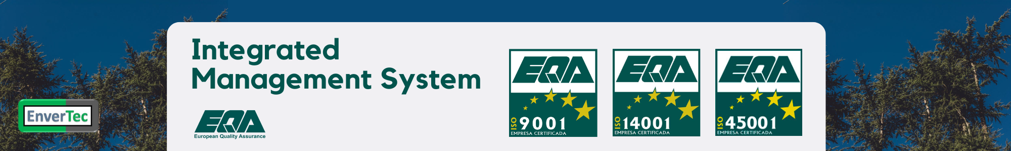 We are pleased to inform that ENVERTEC has extended the scope of its certifications to achieve an Integrated Management System, which extends the existing certification according to ISO 9001 (Quality Management), by incorporating ISO 14001 (Environmental Management) and ISO 45001 (Health and Safety Management of workers).